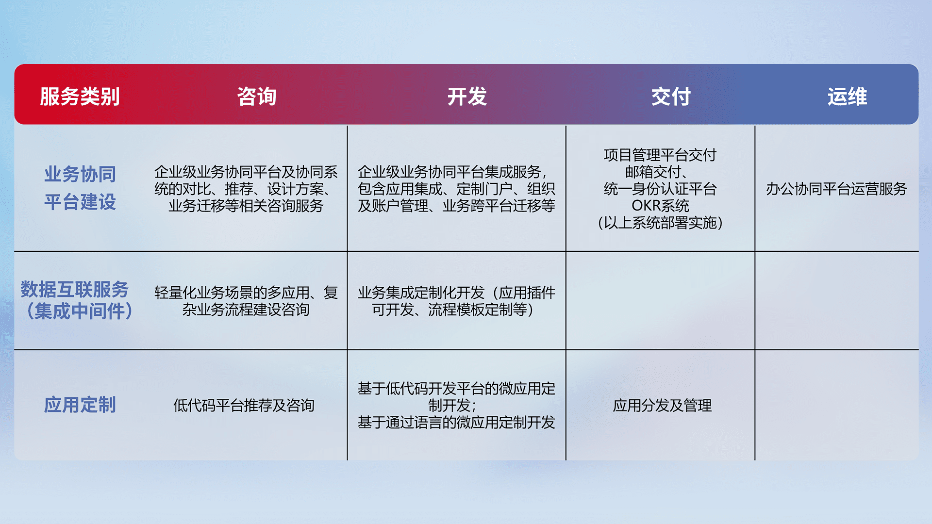 针对钉钉、、企微、、IDaas等平台级产品提供产品的规划、、、方案、、、、交付、、定制化开发等服务,,,实现如统一协同办公、、智能客户服务、、混合会议管理、、、智能数据查询、、等业务场景,,,实现数字化转型。。
