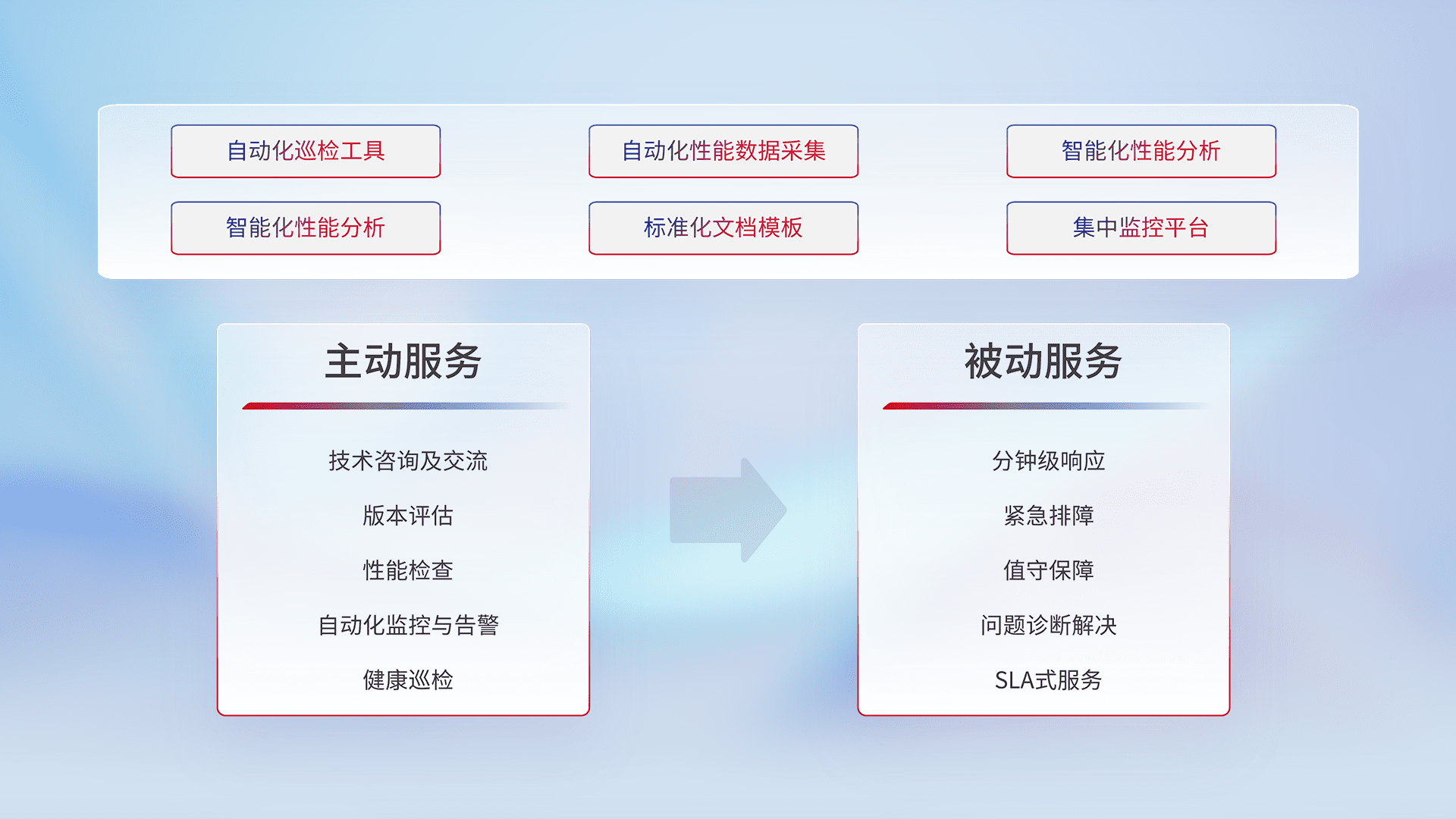 智能化工具和标准化文档,,,保障服务质量,,,提供主动服务(包含技术咨询、、版本评估、、、性能检查、、、自动化监控与告警、、、健康巡检)和被动服务包含(分钟级响应、、、紧急排障、、、、值守保障、、、、问题诊断解决、、、SLA服务)。。。。